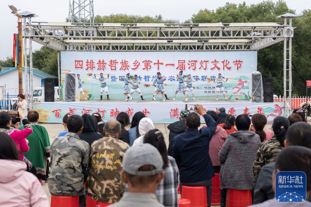 8月30日,在黑龙江省饶河县四排赫哲族乡,赫哲族人在河灯文化节上表演。