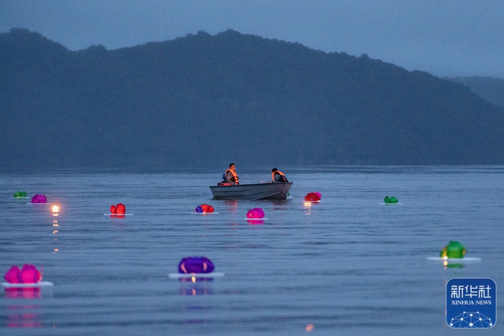 8月30日,赫哲族人在乌苏里江上点亮河灯。