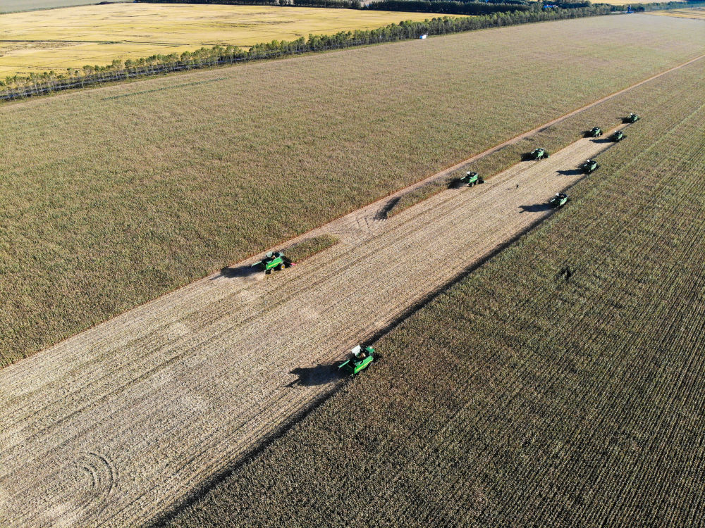 这是9月20日在位于双鸭山市友谊县的北大荒农业股份有限公司友谊分公司一地块拍摄的秋收现场。新华社记者 王松 摄