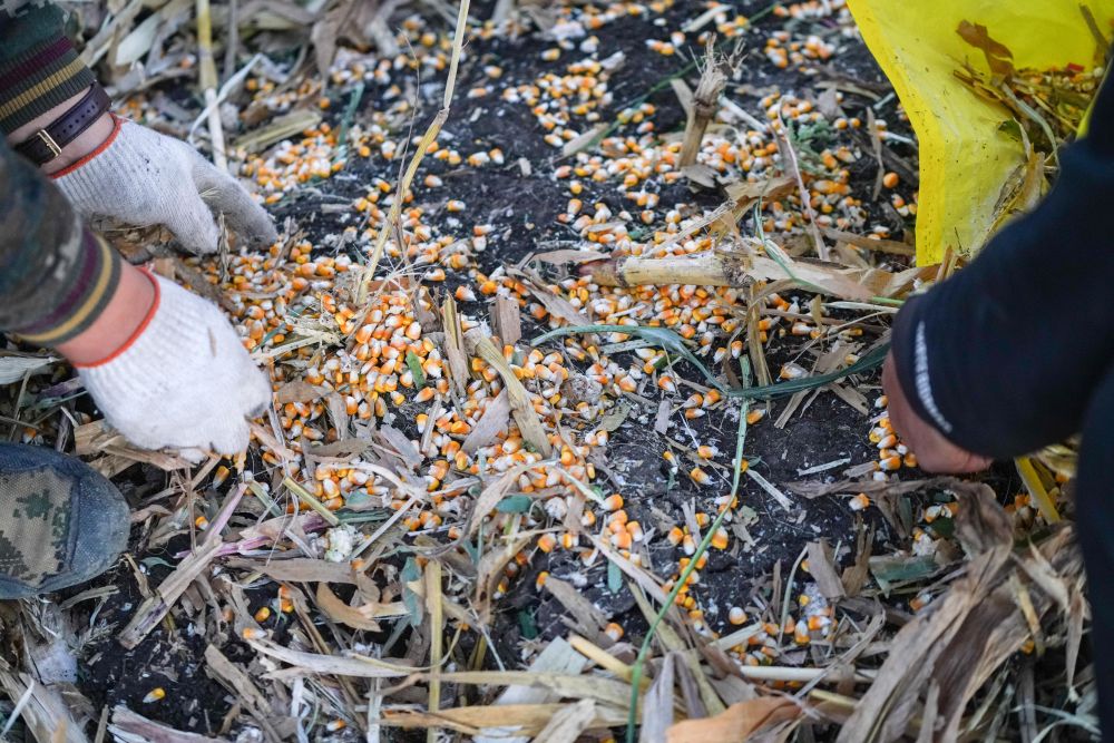在位于双鸭山市友谊县的北大荒农业股份有限公司友谊分公司一地块,农场职工将从接粒车上掉落的玉米粒捡起收好(9月20日摄)。新华社记者 王松 摄pagebreak