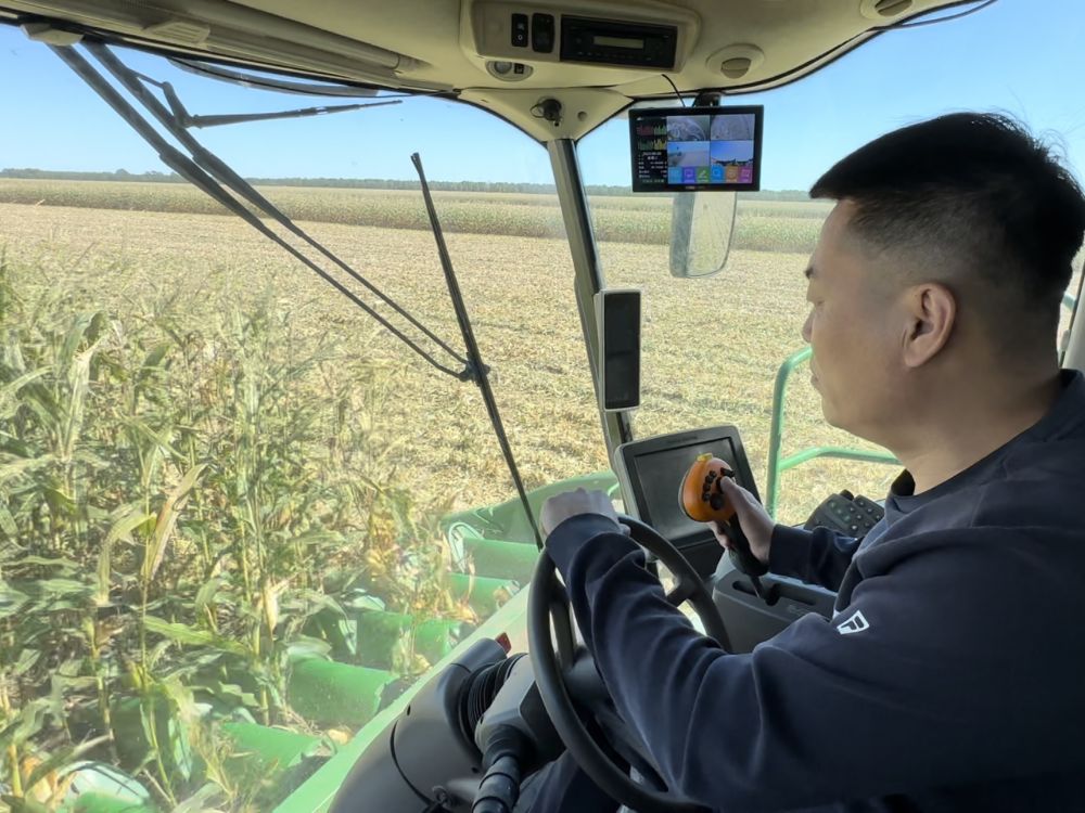 在友谊农场第五管理区的一处玉米田,记者遇到农机手徐晓溪。他说:“我早上9点多就到地里了,上午已经开了3圈,一圈是30亩,一共收了90亩。今天估计要干到天黑,把眼前这片地都收完。”