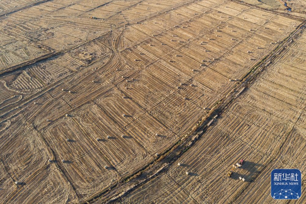 10月18日,在黑龙江省尚志市河东朝鲜族乡,农民驾驶机械运输打包好的秸秆(无人机照片)。新华社记者 谢剑飞 摄