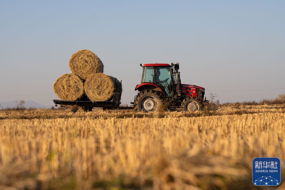 10月18日,在黑龙江省尚志市河东朝鲜族乡,农民驾驶拖拉机运输打捆后的秸秆。新华社记者 王大禹 摄