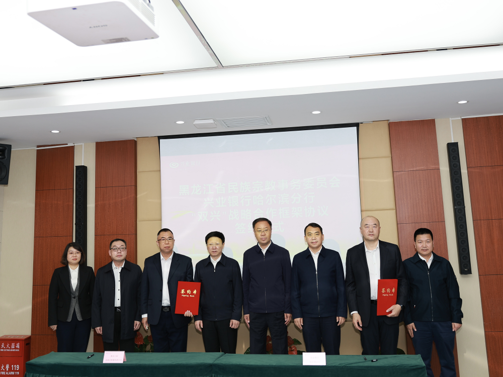 10月30日,黑龙江省民族宗教事务委员会与兴业银行哈尔滨分行围绕“兴边”“兴业”主题,成功举行“双兴”战略合作框架协议签约仪式。省委统战部副部长、省民宗委党组书记、主任王玉升,兴业银行哈尔滨分行党委书记、行长丁武民出席,省民宗委党组成员、副主任马国利,兴业银行哈尔滨分行党委委员、副行长姜鹏代表双方签约,省工商联党组成员、副主席马辉见证签约。
