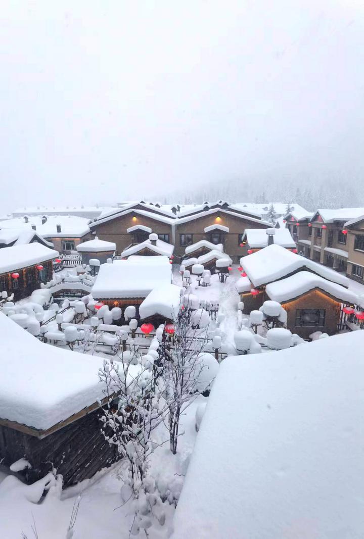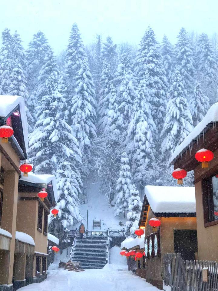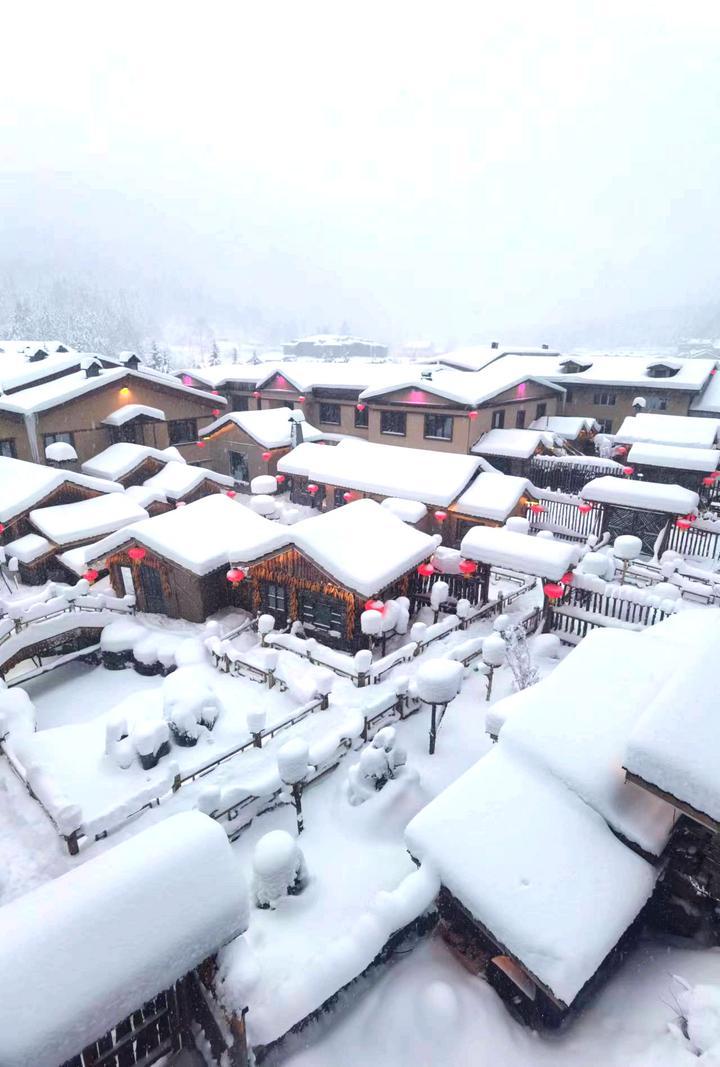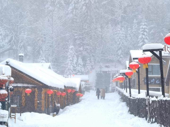 受连日强降雪的装点,目前雪乡景区积雪深度已达到40厘米左右,逐渐形成了“雪蘑菇”“雪蛋糕”“雪舌”等独特雪景。3000余盏大红灯笼悬挂在栈道、房檐上,映衬着洁白的“雪蘑菇”,与皑皑白雪交相辉映,宛如童话世界。