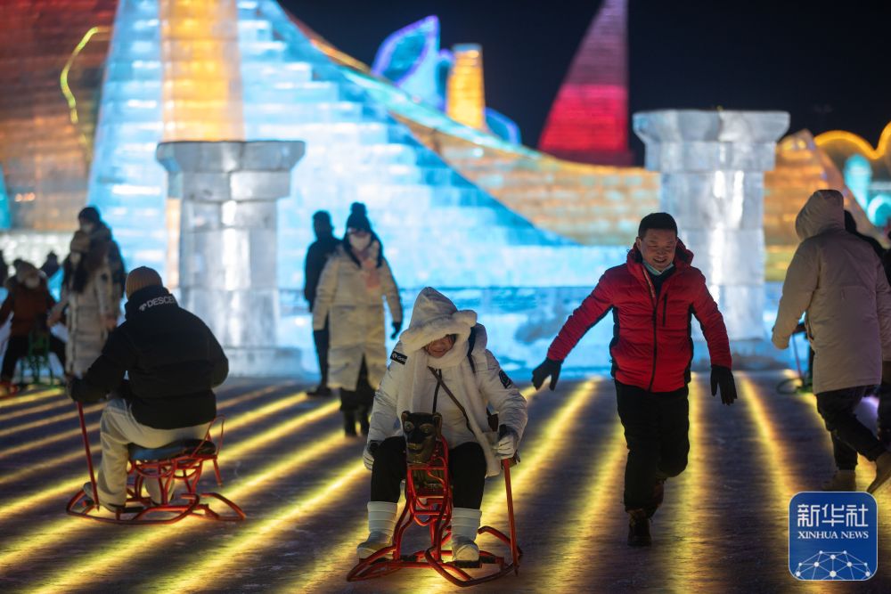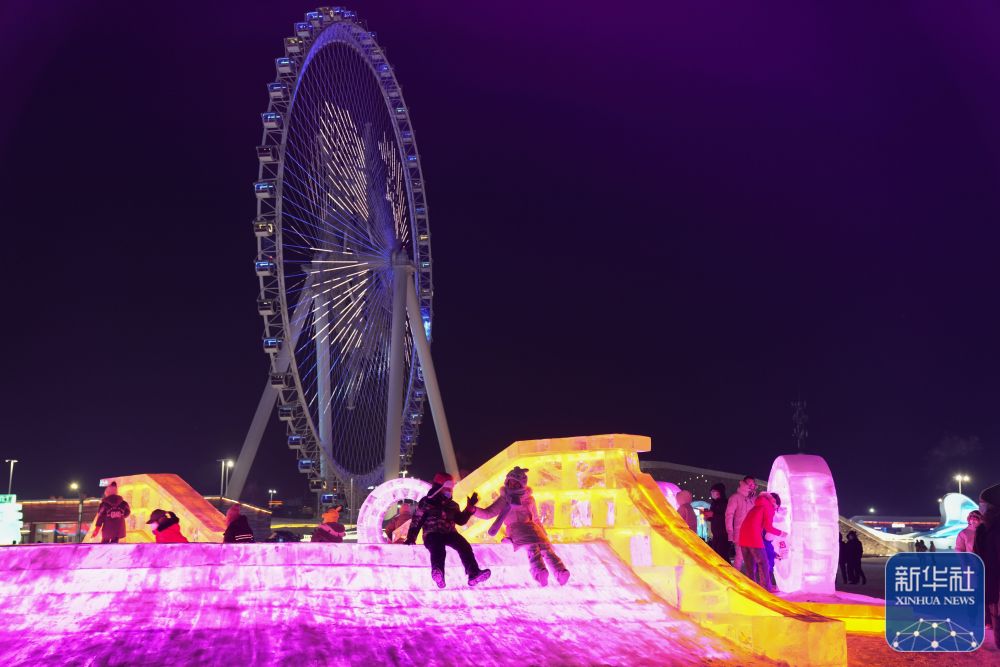↑2022年12月31日,游客在哈尔滨冰雪大世界园区游玩。新华社记者 张涛 摄