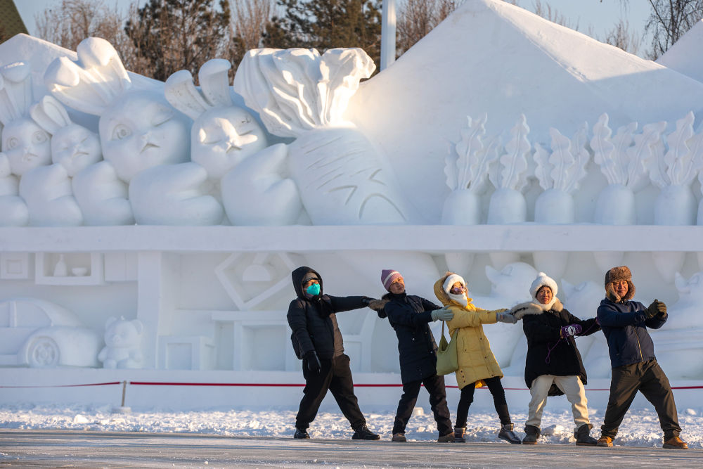 2022年12月31日,游客在第35届哈尔滨太阳岛国际雪雕艺术博览会园区内游玩。 新华社记者 张涛 摄
