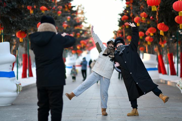 ↑2022年12月31日,游客在哈尔滨冰雪大世界园区拍照留念。新华社记者 张涛 摄