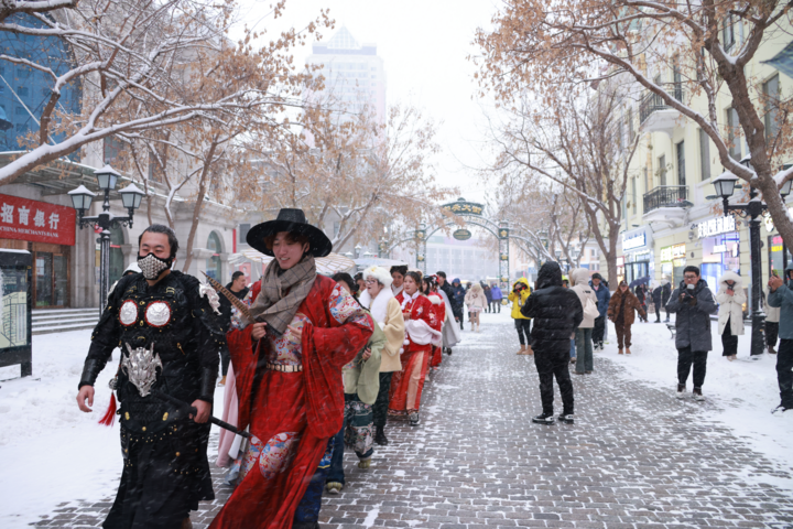 新华社客户端哈尔滨11月28日电(记者何山)日前,在哈尔滨的“百年老街”——中央大街上,一场雪中汉服巡游吸引了众多游客的目光。不同风格的建筑,不时飘落的细雪,映衬着或明艳或素雅的各式汉服,让人们感受哈尔滨这座城市东西方文化融合的魅力。