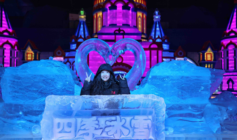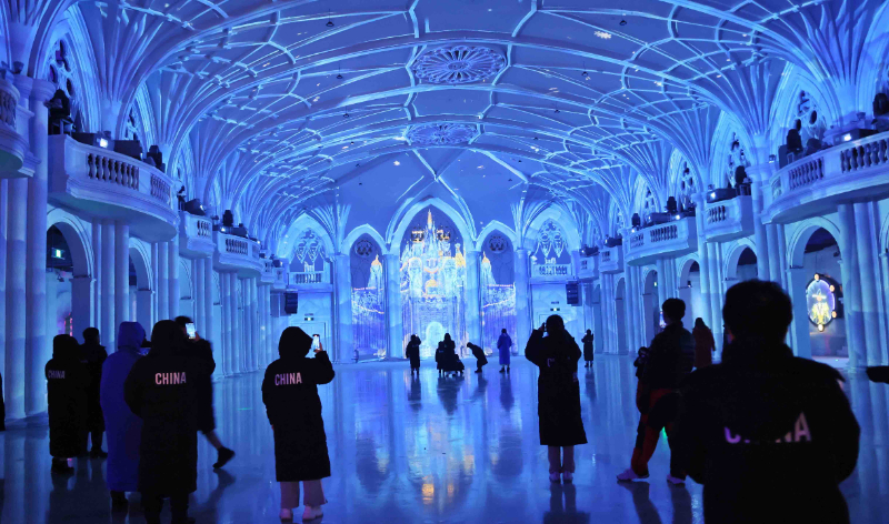 穿过“冰雪序曲”景区,记者来到“雪国冰堡”区。由冰块制作而成的索菲亚景区建筑群,在彩冰和灯光的加持下,别有一番异域风情,引得不少游客在此驻足打卡拍照。