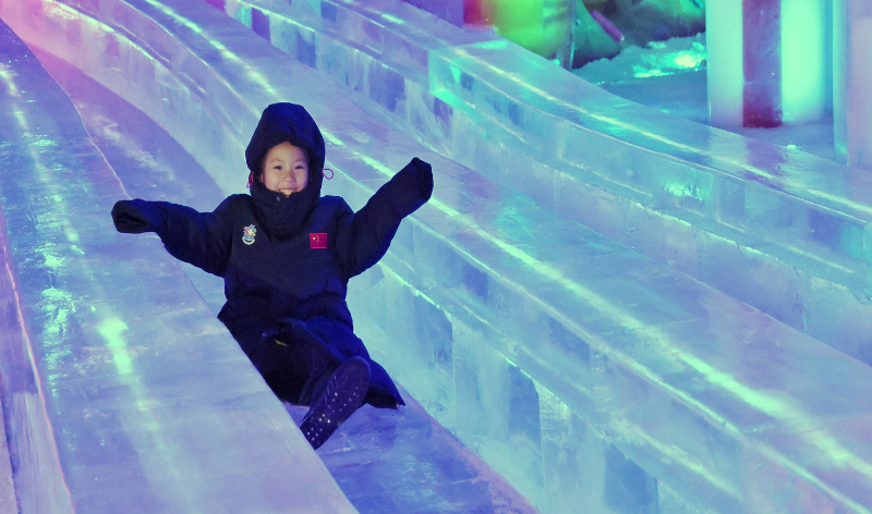 “拿上雪圈,我们再滑一次。”冰雪小世界里人气最高的非冰滑梯莫属。记者在现场看到,冰滑梯入口处游客络绎不绝,大人们、孩子们拉着雪圈从滑梯上不时滑下,惊呼声和欢笑声不绝于耳。