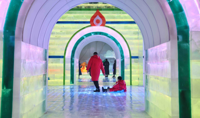 来到冰雪小世界,不仅可以看到或宏伟、或精致的冰雕景观,还可以沉浸式体验冰雪与光影带来的奇幻与神秘。“光影大厅”地面布满蓝色、白色、绿色、黄色等点状光源,在后台电子设备控制下,各个“小圆点”不断闪烁,顿时整个大厅看上去五彩斑斓,极具科技魅力。