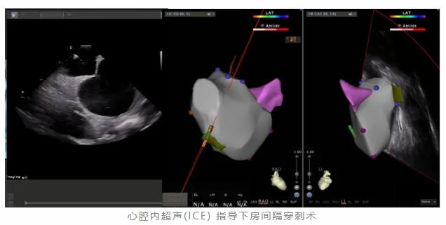 ICE(intracardiac echocardiography)即心腔内超声技术。与传统体外超声诊断技术不同,心腔内超声技术是将一根圆珠笔芯粗细的超声导管,通过外周血管置于心腔内,利用位于导管头端的超声探头,近距离、实时精准获取心脏解剖结构,并可以同步显示心脏血流动力学,实时动态评估局部心肌和整体心脏功能。近年来,在心脏介入治疗和电生理检查中,显示出良好的应用前景。心腔内超声就像医生安在心脏内的一双眼睛,医生可以通过超声图像“直视”心脏结构,并结合三维解剖标测系统构建出心脏模型,更快更好更安全地完成心脏手术。ICE具有操作灵活、精准安全、无需全身麻醉、无食管损伤、无需使用造影剂和显著减少X线暴露时间等优点,在房颤消融手术中主要应用于探查心腔内血栓、引导房间隔穿刺、精准定位消融导管及监测术中并发症等方面,大大优化了手术流程、提高了手术安全性。