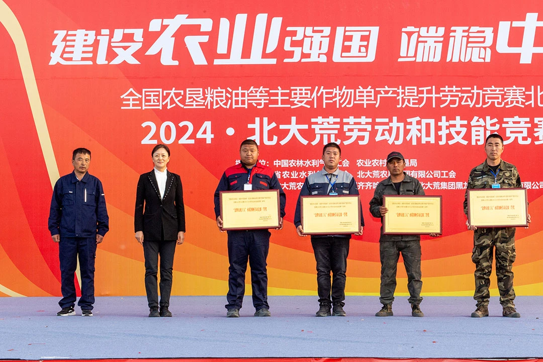 9月28日,在北大荒农垦集团齐齐哈尔分公司查哈阳农场万亩大地号上,随着全国劳模赵海龙等五位北大荒劳模工匠代表共同推动启动杆,由黑龙江省农业水利气象工会、北大荒农垦集团工会主办,齐齐哈尔分公司承办的“建设农业强国 端稳中国饭碗”全国农垦粮油等主要作物单产提升劳动竞赛北大荒行动暨2024·北大荒秋季劳动和技能竞赛正式启动。