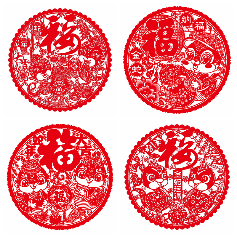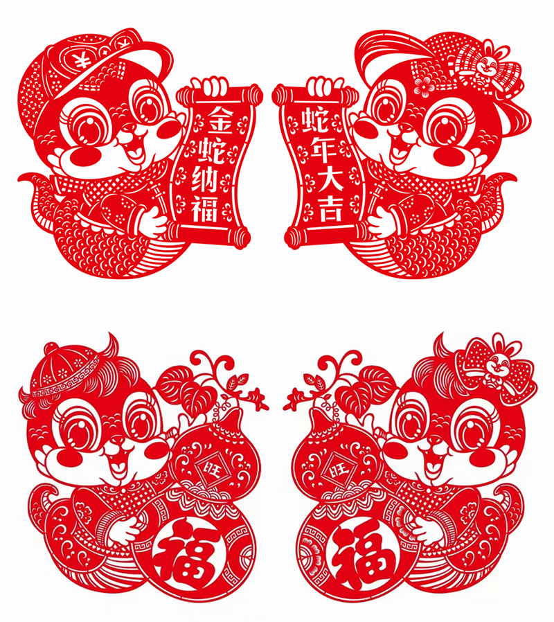 新春佳节之际,他在剪纸中还配上灯笼、葫芦、花朵、钱币等传统纹样,寓意着“福禄安康、迎祥纳福、蛇年大吉”。