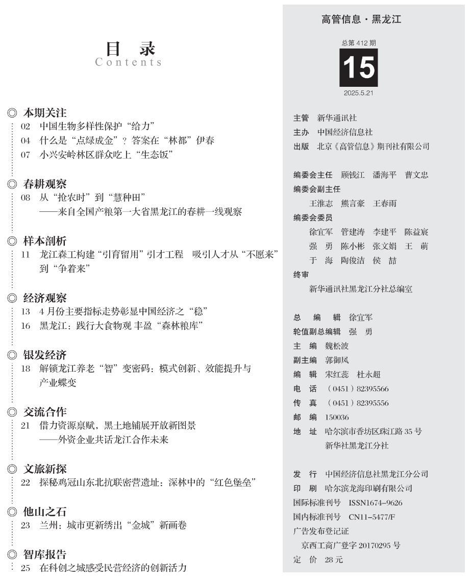 《高管信息》是新华社主管、中国经济信息社主办,具有国内统一刊号的经济信息期刊,主要刊登新华社记者采写的参考报道、决策信息,传达中央最新精神、解读最新方针政策,介绍各地各领域新成就、新经验以及遇到的新问题、新情况。《高管信息·黑龙江》紧紧围绕龙江各地党委政府中心工作,聚焦经济社会发展经验做法、问题困难、对策建议,为各级党政机关、企事业单位领导提供决策参考。