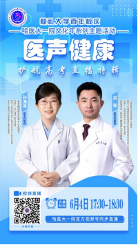 哈医大一院“医声健康”医学科普直播栏目,推出护航高考直播特辑,6月4日首期节目邀请临床营养科、心理科专家科普高考期间饮食营养安全与心态调节等专业话题,为家长及学子答疑解惑,助力考生以最佳状态迎接高考。哈医大一院“医声健康”医学科普直播栏目还将陆续邀请眼科、整形美容科及减重专家科普家长及学子关心的相关话题。