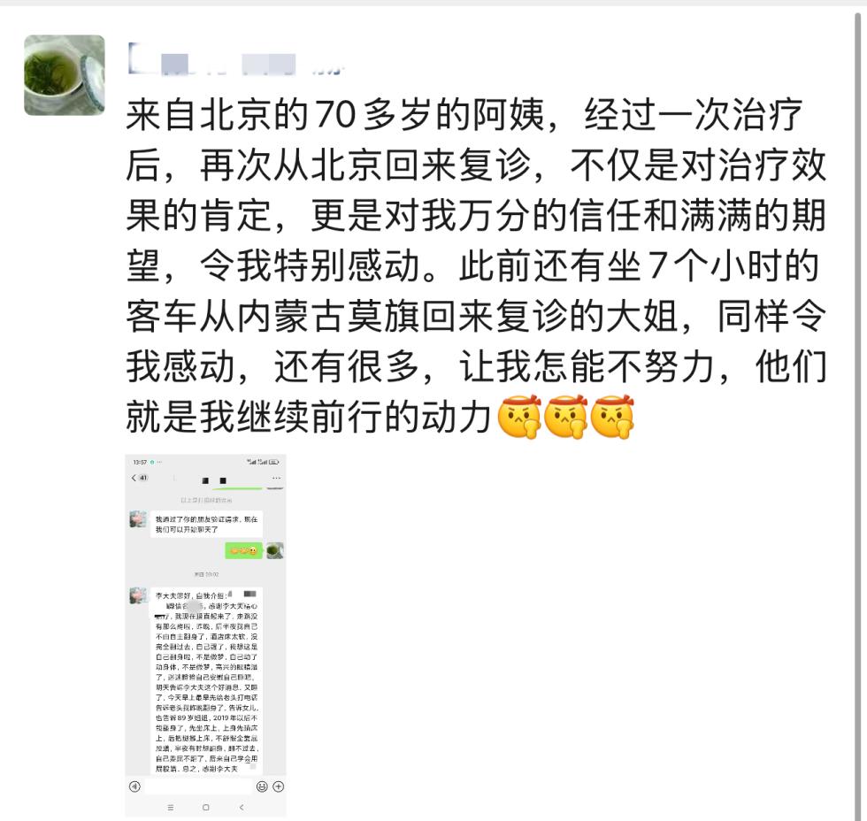 李阿姨的故事不是个例。在李赫的手机里,存着二十多个来自省内佳木斯、齐齐哈尔、牡丹江等地的复诊提醒。“有位从内蒙来的大姐坐7小时客车来治肩周炎,治疗后能自己抬胳膊晾衣服了,复诊时还带了锦旗。”他说,“这些患者大老远过来,就是为了治好病。”