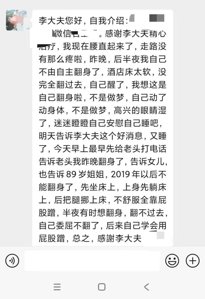 李阿姨的微信里藏着多年来病痛记忆。因颈肩腰腿疼,整个脊柱侧弯,20多年来直不起腰,睡觉只能先侧躺,把腿一点点挪上床;想翻身时,只能用屁股蹭着床单挪动,半夜疼醒了好多次,急得掉眼泪。“那时候觉得,这辈子可能就这样了。”她回忆。