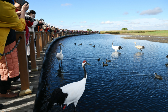 张桢介绍,扎龙生态旅游区在原始的湿地景观为核心的基础上打造了扎龙十三景,更好地将自然景观与人文景观相融合。这里四季,季季景不同,每一季都散发着自然馈赠的无限魅力。2024年十一期间,景区共接待游客近10万人次。今年为了给游客更好地游玩体验,景区举办“鹤中秋国庆、游大美扎龙”活动,每场训飞前增设“鹤仙子”游船演绎,雾森系统的增设让广大游客朋友们身临其境的感受仙境、仙子、仙鹤三位一体的视觉盛宴。丹顶鹤野化训飞时间为每日四场,上午9点半、11点,下午2点、三点半。还为广大游客朋友们搭建节日场景打卡墙与互动游戏等等,翩翩起舞的丹顶鹤已敞开怀抱迎接五湖四海的游客朋友们到来,共同感受人与自然和谐共生的美好。