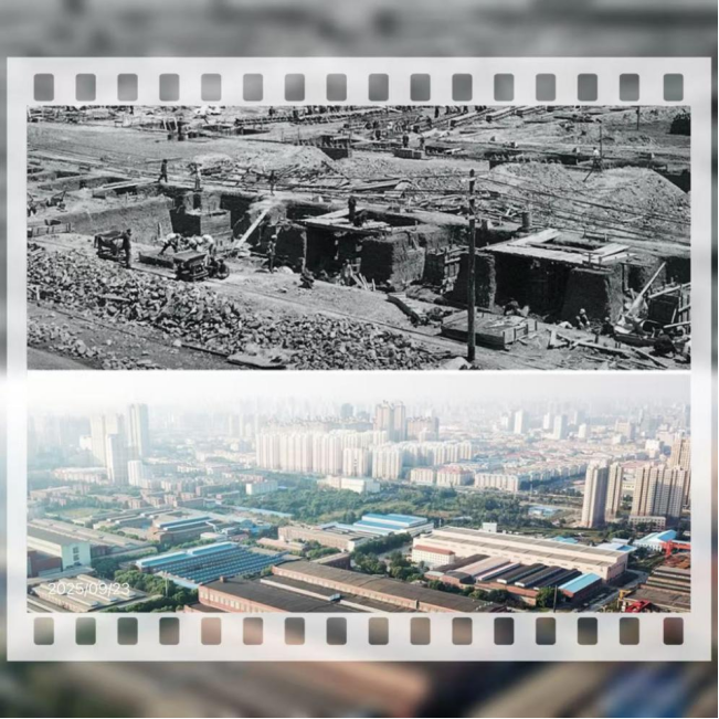 这是一张拼版图片,上图为上世纪五十年代,全面基础工程接近尾声时的工厂(资料图片);下图为9月4日无人机拍摄的哈电电机厂房局部(新华社记者王建威摄)。
