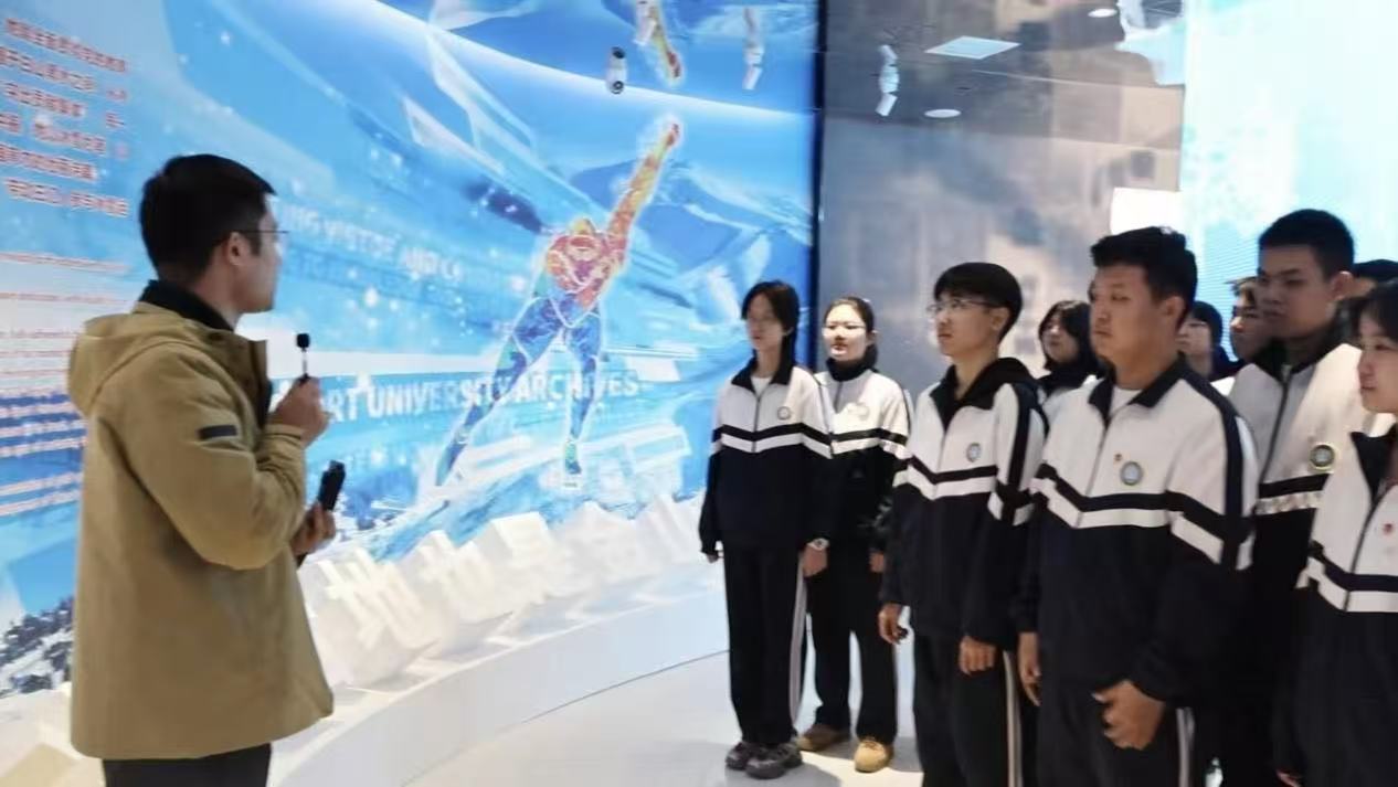 这是哈尔滨体育学院积极响应我国加快建设体育强国号召,推进大中小学思政课一体化建设的创新实践。活动现场,彭涛老师依托馆藏冰雪运动史料,将体育文化传承与爱国主义教育深度融合,通过生动讲述我国冰雪运动发展故事,引导学生深刻理解北京冬奥精神和冠军精神的时代内涵。