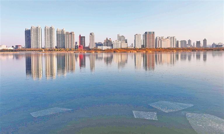 近日,松花江哈尔滨城区段开始结冰。江面新冰晶莹剔透,宛如一面巨大的镜子,静静倒映着江岸的诸多地标。公路大桥的雄伟线条、江上城堡的梦幻造型、太阳桥的现代感、江边高楼的时尚气息,都在冰面上清晰呈现,构成一幅如梦似幻的冬日画卷,美不胜收。(记者 张澍摄)