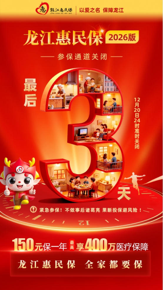 “龙江惠民保2026版”参保通道将于2025年12月20日24时正式关闭,当前参保已进入最后3天倒计时。为方便广大民众全面了解这一惠民补充医疗保障政策、精准把握参保窗口期,相关部门对产品核心保障内容及年度优化亮点进行梳理说明。