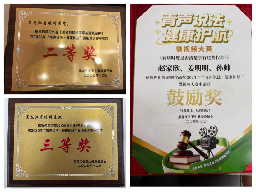 在此次大赛中,黑龙江省眼科医院凭借深耕医疗普法的扎实实践与创新表达,交出亮眼答卷:三病区创作的《患者的知情同意与隐私保护》,依托精准的法律解读与贴近临床的场景呈现,荣获二等奖;医院选送的《依法执业·守护医患》聚焦医疗执业规范,以务实视角搭建医患法治沟通桥梁,斩获三等奖;二病区作品《看病时您是否清楚享有这些权利》围绕患者核心权益展开科普,语言通俗、内容实用,获得鼓励奖。三部作品均立足眼科医疗特色,将专业法律知识与临床服务场景深度融合,让普法宣传更具针对性和感染力。