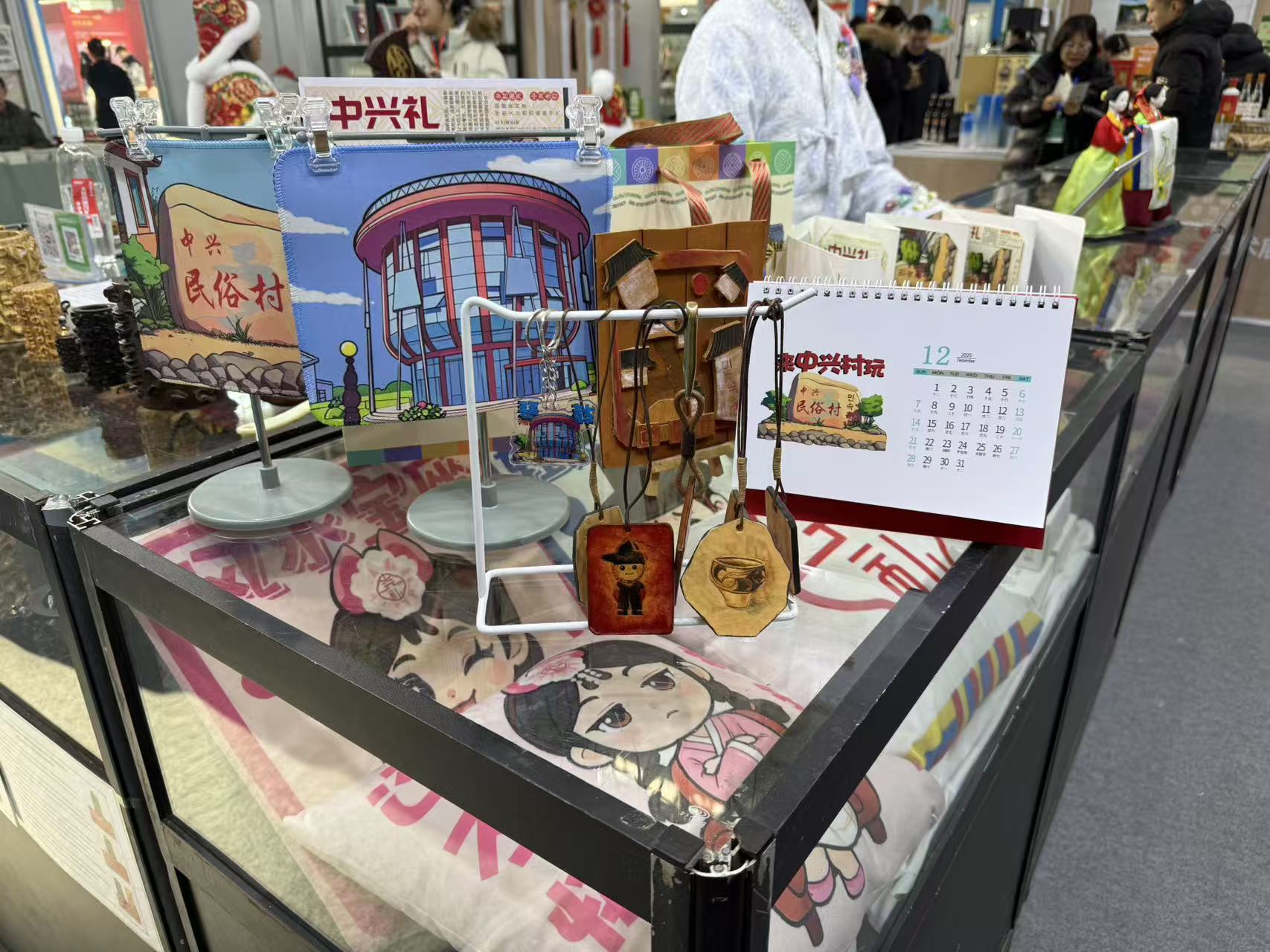 走进西安区展区,中兴村系列文创产品整齐陈列,萌版朝鲜族孩童形象的抱枕、琴鼓造型的明信片、手绘导览图主题杯垫等产品,将民俗文化与现代设计完美融合。同时,设计师团队采用游客视角的仰拍构图呈现琴鼓景观,让明信片实现“所见即所得”的游览记忆留存。