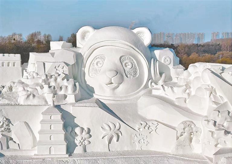 第38届哈尔滨太阳岛雪博会自开园以来,游客纷纷来此赴这场冰雪之约。主雪塑“点赞中国”总长103米、宽20米、高33米,用雪量达3万立方米。主雪塑核心是一只身着宇航服的大熊猫,在它的身旁,雪砌的长城如巨龙蜿蜒,古朴的大雁塔以雪为骨。一边是源远流长的传统文化,一边是突飞猛进的科技成就,两种力量在雪的世界里交融,诉说着中国的辉煌历程。园区内,游客在制作精美的雪雕前打卡拍照,记录下精彩瞬间。(记者 郭俊峰 张澍 苏强摄)
