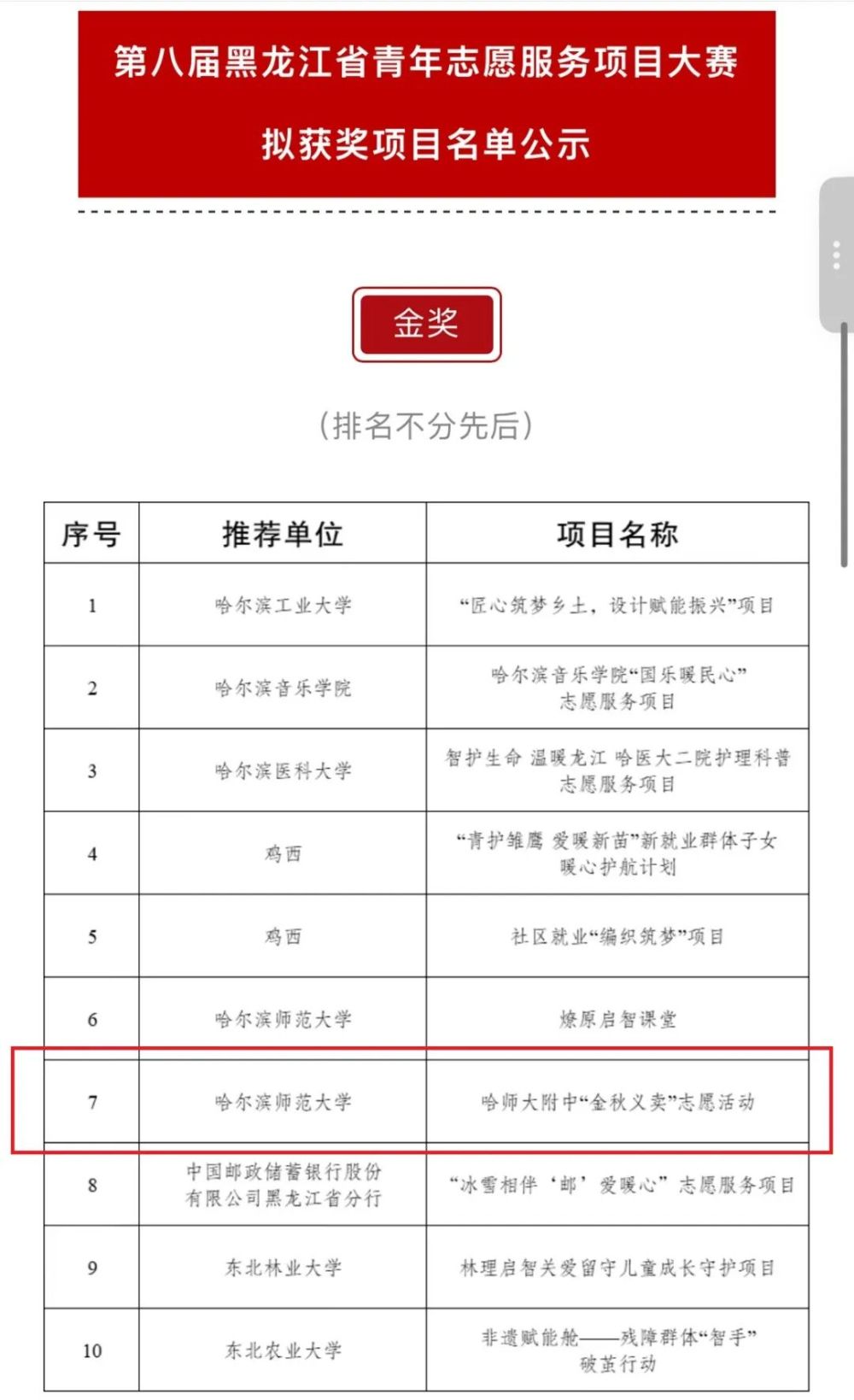 此次金奖荣誉,是对哈师大附中“公益+”大思政教育实践成果的充分肯定。未来,学校将以此次获奖为契机,持续深耕志愿服务领域,让公益精神在校园生根发芽,让青年力量在奉献社会中绽放光彩,为地方精神文明建设注入更多青春动能。