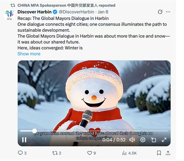 “冰封松江迎远客,雪映五洲话未来。”1月6日,“世界市长对话·哈尔滨”活动在冰城哈尔滨启幕,来自多个国家的市长、副市长及市长代表围绕冰雪经济、城市治理与文化传承展开交流。活动举办期间,哈尔滨海媒平台(@Discover Harbin)发起话题#GlobalMayorsDialogueHarbin,吸引了众多中国驻外使领馆账号、海外博主及与会嘉宾个人账号积极互动,有效助推哈尔滨国际“朋友圈”在线上线下同步拓展。