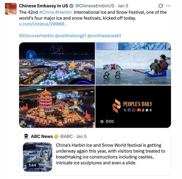其中,中国驻美国大使馆X账号(@ChineseEmbinUS)在哈尔滨冰雪节推文中@哈尔滨官方X账号。中国驻加拿大大使馆X账号(@ChinaEmbOttawa)和中国驻多伦多总领馆X账号(@ChinaCGToronto)发布、转发哈尔滨官方X账号帖文,全面呈现加拿大埃德蒙顿市长安德鲁·纳克参会实况、追溯两市冰雪渊源,并与哈尔滨X官方账号积极互动;值得关注的是,安德鲁·纳克的个人Instagram账号(@andrewknack)也点赞了哈尔滨官方X账号的活动启幕内容。