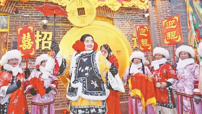近日,在哈尔滨市道外区中华巴洛克历史文化街区,黑龙江省文旅厅主办的“龙江冰雪游”巡游活动吸引了众多游客参与其中。现场互动热闹非凡,各地游客争相与“冰雪公主”合影,有的还即兴加入秧歌队伍扭起大秧歌。年轻情侣主动扮演“新郎”“新娘”角色,在演员指导下完成传统婚俗体验。孩子们则围着腰鼓队学习鼓点打法,欢声笑语与锣鼓声交织,将冬日老街变成欢乐的海洋。(记者 张澍摄)