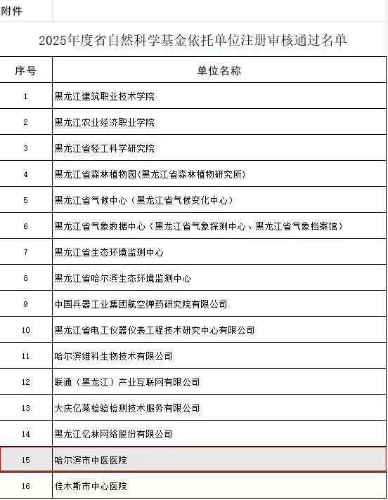 近日,黑龙江省科学技术厅正式批复,同意哈尔滨市中医医院成为省自然科学基金依托单位。这一资质的获批,标志着该院在科研平台建设、学科发展水平及综合管理能力上获得省级权威认证,具备独立组织申报省自然科学基金项目的资格,为黑龙江省中医药领域基础研究与应用基础研究注入新动能。