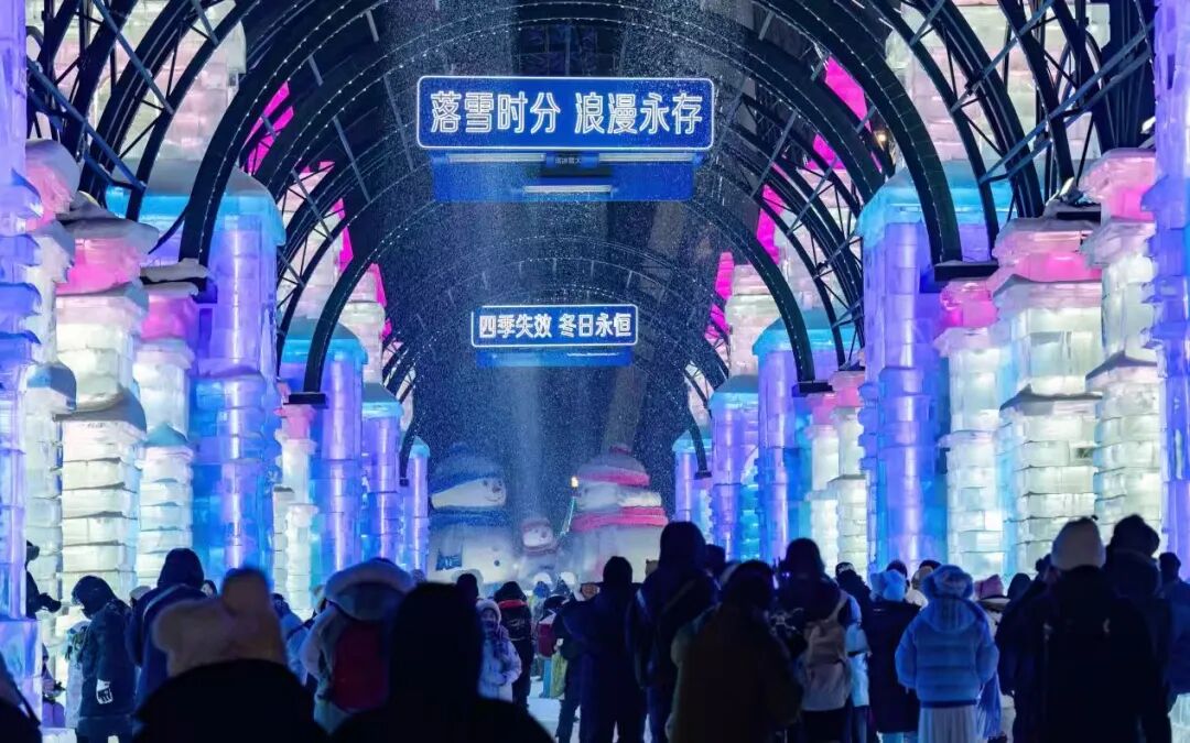 夜幕降临后,冰雕霓虹次第亮起,多彩光晕与洁白雪花相映成趣。“冰穹雪幕 为你绽放”“落雪时分 浪漫永存”“四季失效 冬季永恒”“魔法飞花 点亮冬日”“冰雪奇缘 一步入梦”五组发光灯牌装点穹顶,让长廊氛围感拉满。