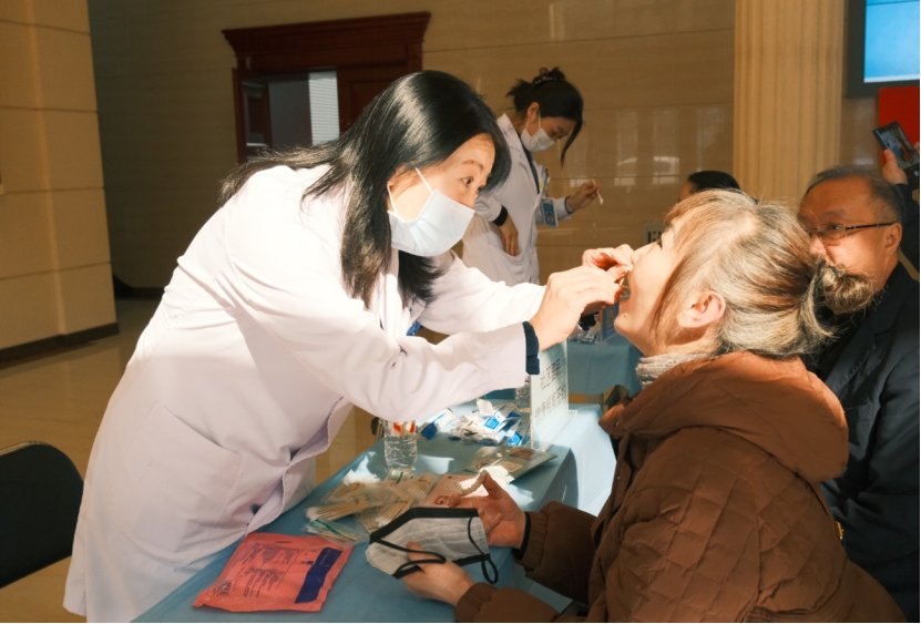 此次活动由哈医大一院口腔修复科主任孙宇、副主任任丽萍和护士长高吉雳带队。义诊现场,专家团队为百余名社区居民提供专业口腔健康检查、咨询服务及口腔保健科普资料,重点针对中老年人常见口腔问题开展宣教与初步筛查,耐心解答疑问、细致检查口腔状况,并结合个体情况提供诊疗建议和日常护理指导,帮助群众树立主动健康管理理念、纠正不良口腔习惯。