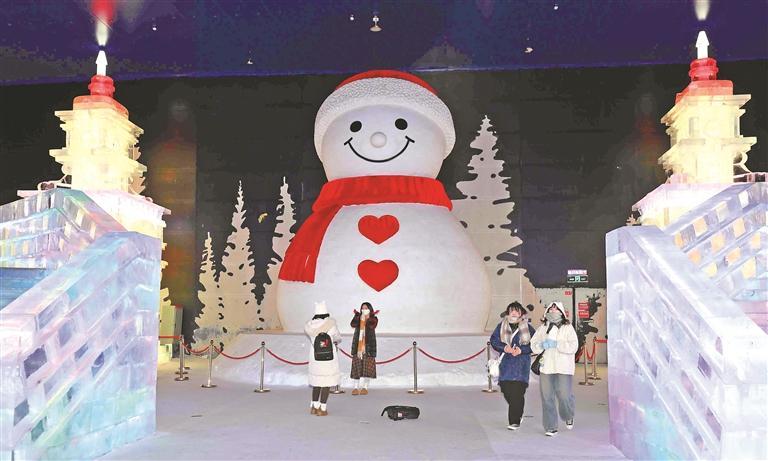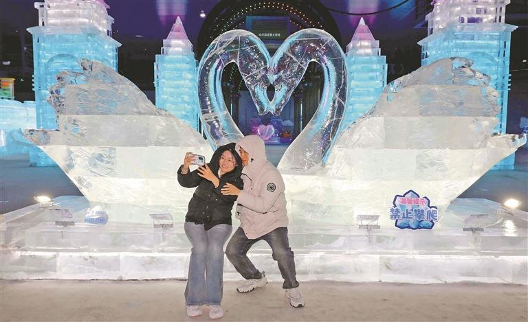 近日,哈尔滨冰雪大世界梦幻冰雪馆持续上新。“同心锁”“飘雪的哈尔滨”等新景观备受游客青睐——登上冰滑梯,如离弦之箭呼啸而下,畅享乐滑;置身人工飞雪情境中,在雪雾中旋转、起舞;在精美冰雕前,拍照打卡,快门声此起彼伏……每个人都沉醉在这份独属于冰雪的欢乐之中。(文/摄 记者 张澍)