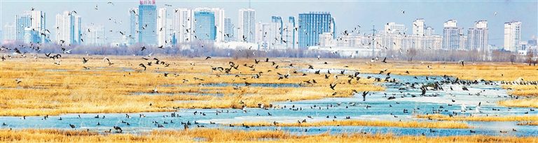 龙凤湿地管委会的工作人员说:“这种现象已经持续好几年了,而今年更多。水质一天比一天好,鱼多了草美了,又赶上迁徙季,才有了群鸟翔集的景观。”(刘为强摄)