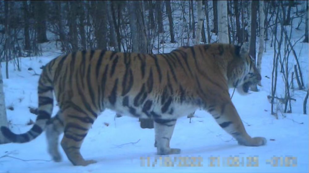 近日,龙江森工集团穆棱林业局有限公司保护区管理局工作人员在例行巡护中,通过野外红外线相机再次发现了野生东北虎“完达山一号”在东北红豆杉国家级自然保护区核心区、东北虎豹国家公园穆棱园区内活动的清晰影像。视频中,一只体型健硕的东北虎,迈着矫健的步伐,悠然地从镜头前走过。