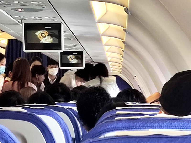 29日上午9时,哈医大二院耳鼻咽喉头颈外科一病房主任田霖丽、医生郭岩、护士长郑岩搭乘深圳航空公司执飞的ZH9755航班,从哈尔滨飞往厦门出差。航班中途经停扬州,从扬州起飞不久,医生郭岩忽然发现前排座椅剧烈晃动,乘客的手机也掉落在地面,她捡起手机时发觉情况异常,发病旅客是一位约30岁的男性,已出现抽搐、牙关紧闭,嘴边溢出白沫等症状。