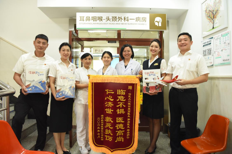 7月3日,深圳航空哈尔滨分公司乘务组人员一行四人特意来到哈医大二院耳鼻喉科一病房,为在飞机上挺身而出、全力救人的医护人员送上锦旗,对她们见义勇为、救死扶伤的精神表示感谢。田霖丽说:“当时没有多想,救死扶伤是医务工作者的本能,大家只是做了医生该做的事。”机组人员表示,医生们在乘务人员之前发现异常情况,及时挽救了患者的生命,乘务员和乘客们也配合得很好,飞机虽然延误了几小时,但大家都表示理解。(田为 方若冰)
