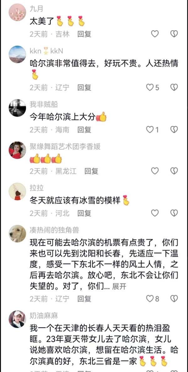 “双向奔赴点燃全民参与的热情”。尔滨本身的冰雪旅游本已成熟,今年之所以爆棚,得益于自媒体传播。今年尔滨的项目创新、业态翻新、服务贴心确实前无古人。哈尔滨花大力气团宠——“小金豆”,让“小金豆”“淘宝”冰城,城市和游客开始了双向奔赴。