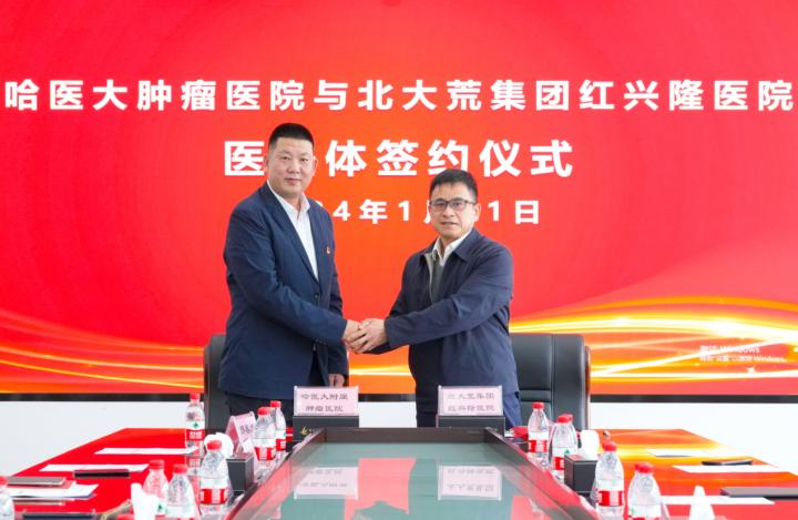 哈医大肿瘤医院副院长孟庆威(左)与北大荒集团红兴隆医院院长李正全(右)签署医联体合作协议。