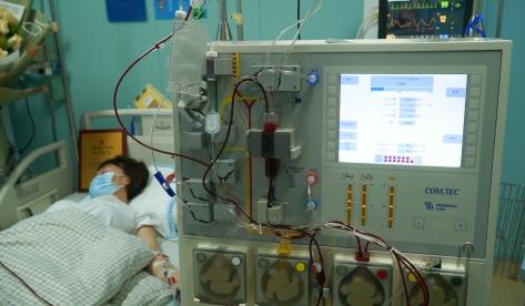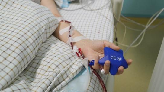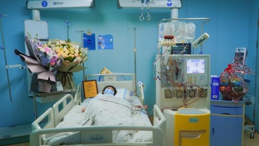 走进移植病房,造血干细胞采集室内机器嗡嗡地转着,张悦正平躺在病床上进行采集,造血干细胞混悬液慢慢流入收集袋,旋转的仪器转出了生的希望。