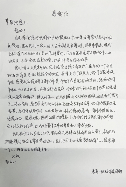 起初,张悦并不知道受捐者的身份。在几天前收到受捐者父母的感谢信时,她才知道受捐助者是一位8岁的男孩。“患者能够找到一个合适的捐献者非常不易。作为医务工作者,我想用另外一种方式帮助到他们,这也是我新年做的最有意义的一件事。”张悦在病床上说道。
