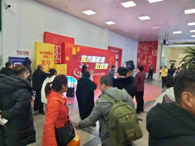 2月6日15时,佳木斯东郊机场航站楼内,在工作人员的指引下,旅客们有序办理登机手续,同时设置的龙年打卡地、摄影展等文化场景受到旅客关注,纷纷拿起手机,记录美好旅程。