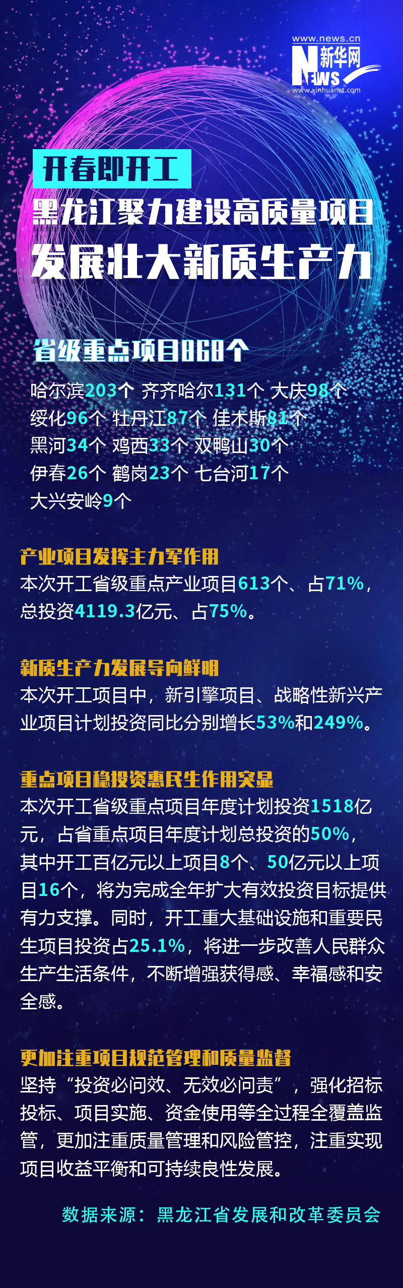 据了解,黑龙江全省3394个重点项目开春全面开工,同比增长33.6%。其中,省级重点项目868个,同比增长53.6%,总投资5493亿元,涵盖数字经济、生物经济、冰雪经济、航空航天、高端装备、新能源、新材料、基础设施、民生改善等重点领域,以新项目打造新产业、塑造新优势、培育新动能,已成为全省上下的高度共识和共同行动。