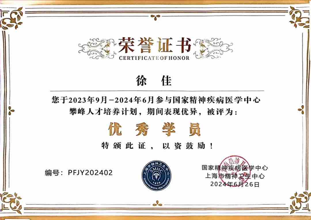 近日,国家精神疾病医学中心(上海市精神卫生中心)“攀峰人才培养计划”结业仪式在上海举行。哈尔滨市第一专科医院医生徐佳在此次培训中表现突出,在来自全国各地的19位学员中脱颖而出,与其他三位精神医学领域的行业同仁获得优秀毕业学员称号。